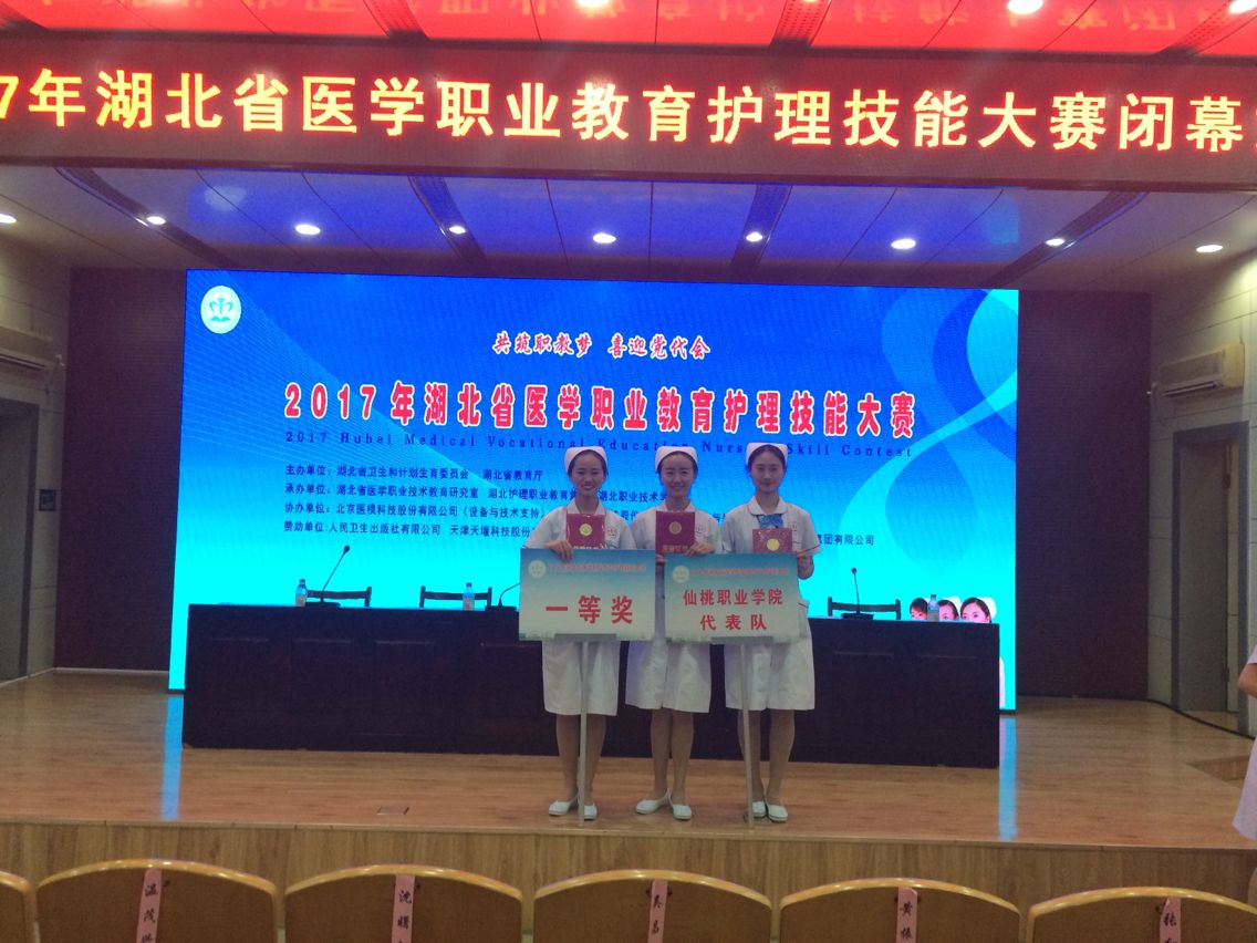 2017年湖北省医学职业教育护理技能大赛于6月9—11日在湖北职业技术学院举行。本次大赛中,我院参赛选手表现突出,荣获高职组团体一等奖,谭欣、林瑞颖同学获高职组个人全能一等奖,任逸君同学获个人全能二等奖,另还收获单项一等奖3项、二等奖2项、三等奖4项。
