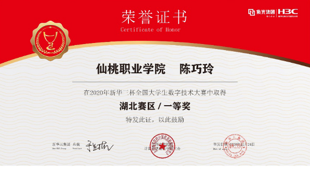 近日,2020年“新华三杯”全国大学生数字技术大赛湖北赛区成绩出炉,我院计算机网络技术专业学生陈巧玲、赵洋洋、王波、谌玄获湖北赛区一等奖,其中陈巧玲获该项赛事全国总决赛资格。