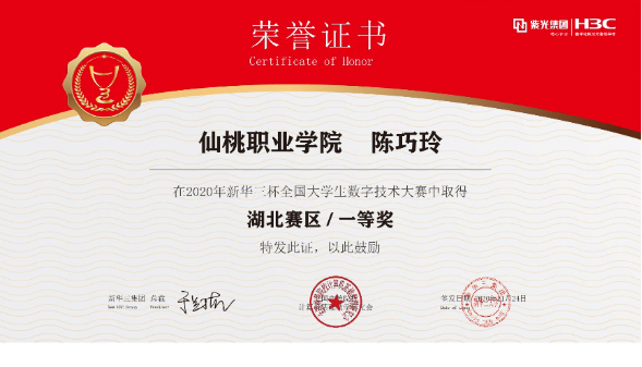 在2020年“新华三杯”全国大学生数字技术大赛湖北赛区比赛中,计算机科学技术学院学生陈巧玲、赵洋洋、王波、谌玄获一等奖,其中陈巧玲晋级全国总决赛。