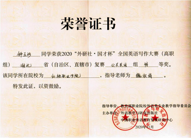 2020年Uchallenge大学生英语挑战赛由演讲、写作、阅读三大赛事组成。在全国英语写作大赛(高职组)湖北赛区比赛中,医学院学生钟玉珍、教育学院学生林艺分获公共英语组特等奖、二等奖,其中钟玉珍晋级全国总决赛,这也是我院学生连续第三年获此资格;在全国英语演讲大赛(高职组)湖北赛区比赛中,教育学院学生韩慧灵、李杨双双获得非英语专业组二等奖。