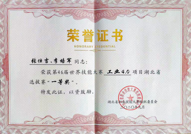 在第46届世界技能大赛工业4.0项目湖北省选拔赛中,机械电子工程学院学生张仕吉、李培军组成代表队,一举夺得团体一等奖。