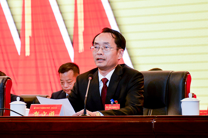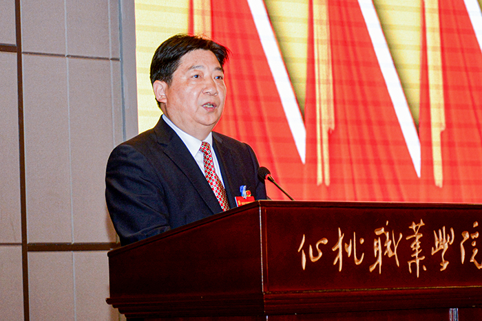 郭百高代表中国共产党仙桃职业学院第二届委员会向大会作题为《竞进提质 勇当标杆 奋力建设全省领先全国一流高水平高职学校》的报告。报告分为三个部分:过去五年的工作回顾;未来五年的工作重点;实现“十四五”奋斗目标的工作举措。