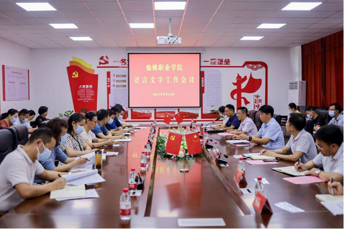 会议组织观看了第24届全国推普周宣传片,宣读了调整后的学院语言文字工作委员会委员名单、《仙桃职业学院语言文字工作委员会工作职责》和《仙桃职业学院语言文字工作委员会办公室工作职责》,各二级院校和省级普通话测试员代表作了交流发言。