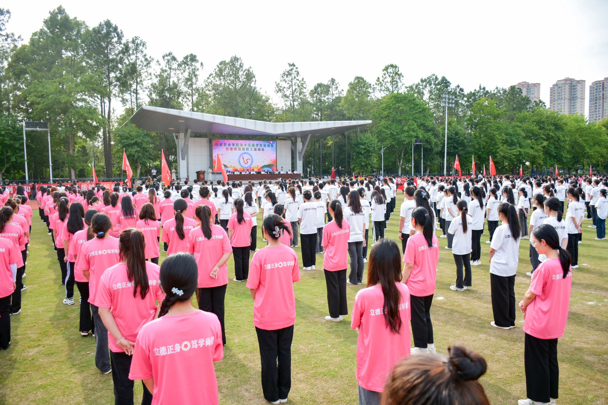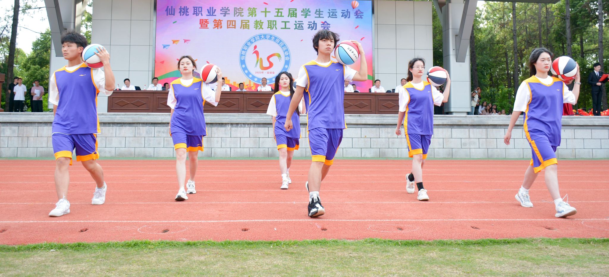 开幕式上,伴随着激昂的《运动员进行曲》,国旗方队、校旗方队、鲜花方队、裁判员方队及各代表队依次入场。各方队步伐铿锵、精神饱满,彰显着仙职师生的活力和风采。