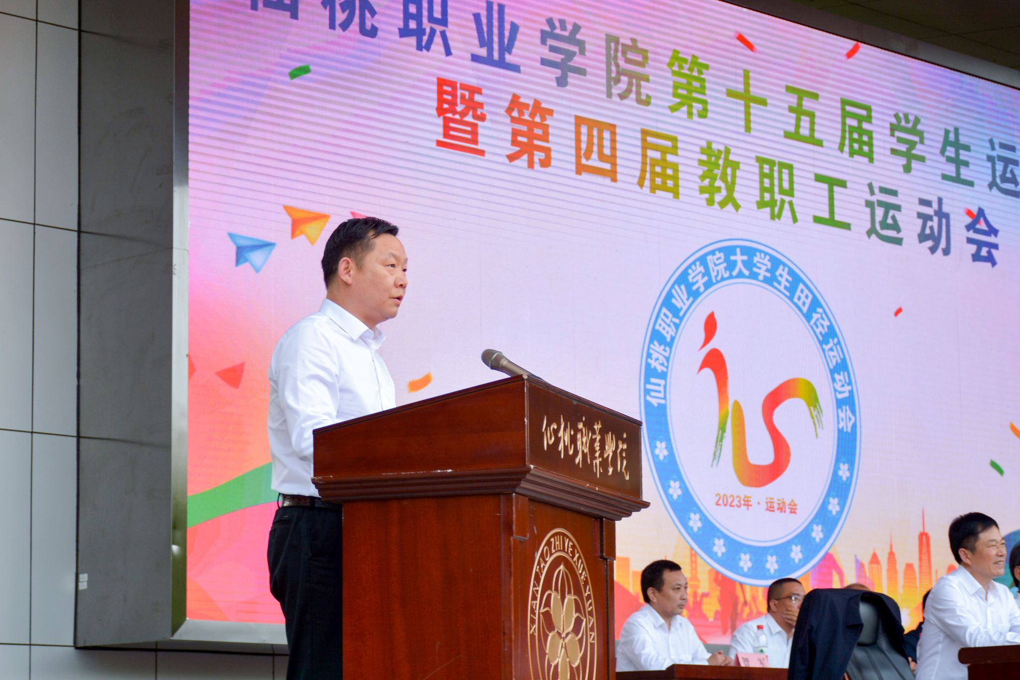 副院长肖松柏致开幕辞。他表示,近年来,学院围绕立德树人根本任务,落实“五育并举”总体要求,坚持健康第一教育理念,广大师生在体育锻炼中增强体质、磨炼意志、收获快乐。本届运动会是对全院师生运动水平的一次全面检阅,也是全院师生精神风貌的一次全面展示,希望广大师生齐心协力、协作配合,共同把本届运动会办成一次精彩出彩的盛会。
