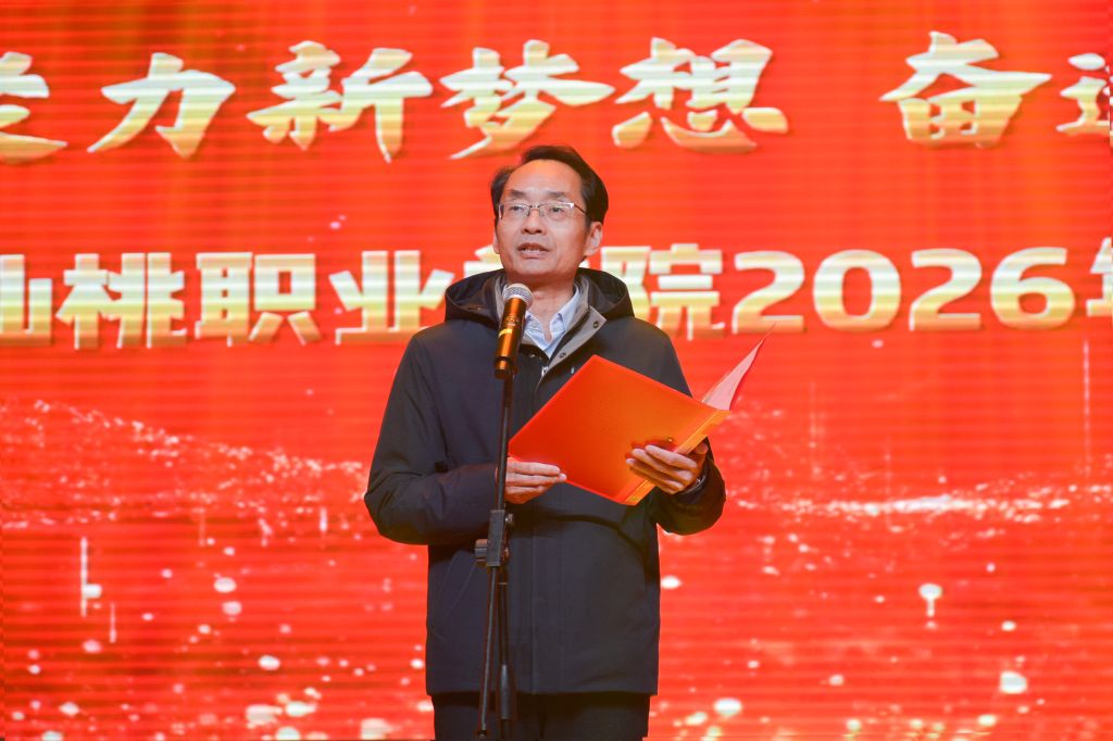 院长李立勇在致辞中向全体师生、广大校友和各界人士致以新春的美好祝福。他表示,回首2025年,学院深入学习贯彻习近平新时代中国特色社会主义思想,聚焦“办学能力高水平、产教融合高质量”,不断丰富完善“12345”工作格局,理想信念根基更加牢固,人才培养成色更加亮眼,内涵建设步伐更加坚实,产教融合质效更加凸显,办学条件保障更加有力,学院高质量发展实现新的突破。展望2026年,学院将以立德树人、提高质量为根本任务,以深化改革、加快发展为工作主线,以新一轮“双高计划”和职业教育“五金”建设为主要抓手,进一步提升办学硬支撑,进一步提振办学新动能,进一步提优办学软实力,为湖北加快建成支点和仙桃经济社会高质量发展贡献更多仙职作为。